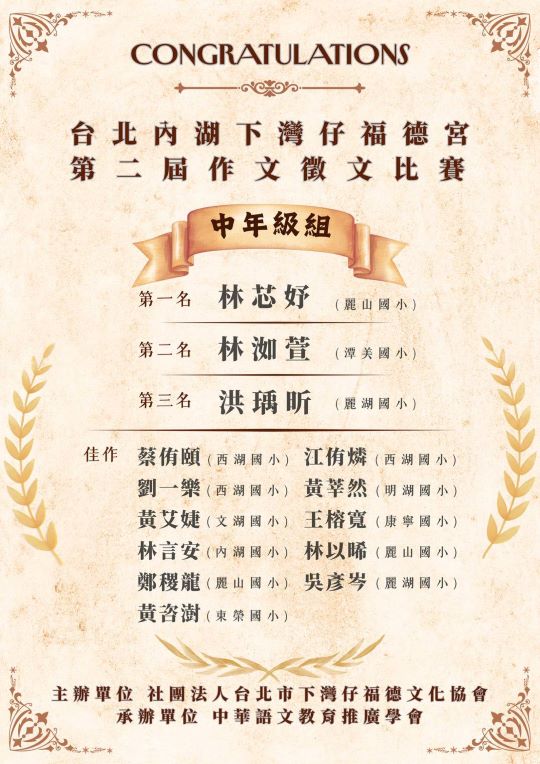 (競賽)內湖下彎仔福德宮徵文比賽得獎名單!國小中年級組
