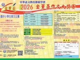 *參賽對象: 中年級(限國小三、四年級學生參加)高年級(限國小五、六年級學生參加)國中組(限國中學生參加)高中(職)組。 *參賽要求: 參賽作品題目:中年級組(我最想收藏的寶物)400-500字/高年級組(挫折給我的禮物)500-600字以上黑色筆書寫/國中組(科技與人性的拔河)800-1000字以上黑色筆書寫/高中(職)組(真相與輿論的距離)1000字以上黑色筆書寫,體裁不限,選材新穎、內容健康、語言生動、形式活潑。來稿必須是作者本人的真實作品,凡已在報刊上公開發表的文章不得參賽。 *評選及獎勵: 本屆大賽將按小學中年級組、小學高年級組、國中組、高中(職)組四個組別分別進行評選。大賽各組設第一名1位,第二名2位,第三名3位,優秀獎若干名。獲獎作品的指導教師均獲優秀指導獎。以上各獎項均由本會頒發榮譽獎狀;前三名加發獎座一個。評選結果將於2026年12月10日在《本會網站http://www.language.org.tw》上公佈。第一名獎金新台幣1200元,第二名獎金新台幣800元,第三名獎金新台幣500元,獲獎作者獎金統一匯款到家長指定帳號。 *參賽辦法: 每篇參賽作品須用專用報名表並繳交報名費300元。學生可自由參賽,也可由老師組織集體參賽。報名表和文宣資料可在下載區下載。 *注意事項: 1、大賽截止日期為2026年10月31日(以當地郵戳為準)。 2、來稿一律用稿紙謄寫,並請標明作者姓名、年級、所在學校詳細地址及郵遞區號。 3、參賽稿件一律不退,請自留底稿。 *來稿請寄: (22043)新北市板橋區文化路二段326號3樓