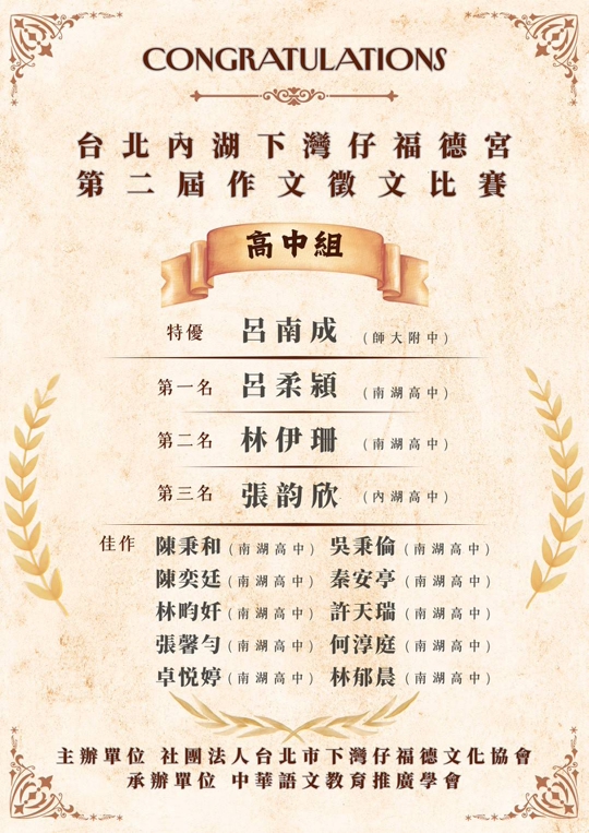 (競賽)內湖下彎仔福德宮徵文比賽得獎名單!高中組
