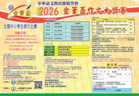 *參賽對象: 中年級(限國小三、四年級學生參加)高年級(限國小五、六年級學生參加)國中組(限國中學生參加)高中(職)組。 *參賽要求: 參賽作品題目:中年級組(我最想收藏的寶物)400-500字/高年級組(挫折給我的禮物)500-600字以上黑色筆書寫/國中組(科技與人性的拔河)800-1000字以上黑色筆書寫/高中(職)組(真相與輿論的距離)1000字以上黑色筆書寫,體裁不限,選材新穎、內容健康、語言生動、形式活潑。來稿必須是作者本人的真實作品,凡已在報刊上公開發表的文章不得參賽。 *評選及獎勵: 本屆大賽將按小學中年級組、小學高年級組、國中組、高中(職)組四個組別分別進行評選。大賽各組設第一名1位,第二名2位,第三名3位,優秀獎若干名。獲獎作品的指導教師均獲優秀指導獎。以上各獎項均由本會頒發榮譽獎狀;前三名加發獎座一個。評選結果將於2026年12月10日在《本會網站http://www.language.org.tw》上公佈。第一名獎金新台幣1200元,第二名獎金新台幣800元,第三名獎金新台幣500元,獲獎作者獎金統一匯款到家長指定帳號。 *參賽辦法: 每篇參賽作品須用專用報名表並繳交報名費300元。學生可自由參賽,也可由老師組織集體參賽。報名表和文宣資料可在下載區下載。 *注意事項: 1、大賽截止日期為2026年10月31日(以當地郵戳為準)。 2、來稿一律用稿紙謄寫,並請標明作者姓名、年級、所在學校詳細地址及郵遞區號。 3、參賽稿件一律不退,請自留底稿。 *來稿請寄: (22043)新北市板橋區文化路二段326號3樓